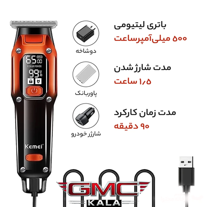 کیمی KM-658 به یک باتری قابل شارژ قوی مجهز است که مدت زمان استفاده بالایی دارد. مدت زمان شارژ کامل این دستگاه معمولاً حدود ۸ ساعت است و پس از شارژ کامل، بین ۴۵ تا ۶۰ دقیقه به صورت بیسیم قابل استفاده است. این ویژگی برای افرادی که زیاد سفر میکنند یا دسترسی دائمی به پریز برق ندارند، یک مزیت مهم محسوب میشود.